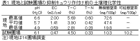 有明海沿岸部重粘土地帯のキュウリ栽培圃場の土壌は全窒素0.42%、全炭素3.9%と地力が高い(表1)。