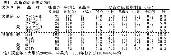 果実品質は、A品率が55〜73%で品種間に差があり、特にC品のひび果や尻腐れ果等差が大きい(表1)。