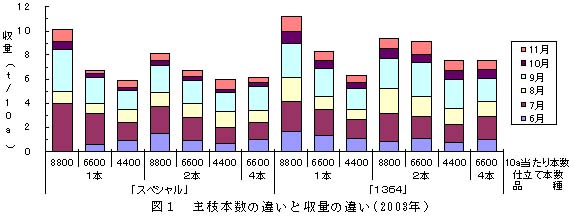 主枝の仕立て本数が1本、2本、4本のうちでは、本数が少ないほど収量は多く、10a当たりの主枝の本数が、4400〜8800本の間では多いほど収量は多い傾向にある(図1)。