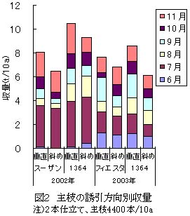 2本仕立ての場合の主枝の誘引方向は斜め誘引よりも、V字型にして主枝を垂直にした方が収量が多く(図2)、品質も良好である(データ省略)。