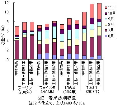 果実は主枝のみ着果させるよりも、主枝と側枝を併用して着果させた方が収量が多い(図3)。しかし、側枝に2果以上着果させると、枝が垂れたり茎葉が繁茂したりし、管理が煩雑になりやすいため、主枝+側枝1果着果が適している。