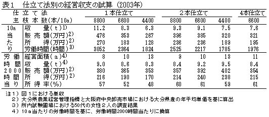 仕立て法別の10aたりの所得は、1本仕立てで10a当たりの主枝本数8800本の場合に最も多いが、単位労働時間当たりの所得は少ないため、仕立て法は、2本仕立てで10a当たりの主枝本数6600〜4400本(畦幅150cmの場合、株間20〜30cm)が良い(表1)。