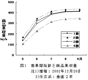 着果開始節は、垂直2本仕立ての場合、主枝の第2節からとすることで、5月の収量が多く、総収量も多い(図1)。