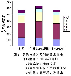 着果法は、主枝着果を基本とし、側枝に着果した場合は摘果する。しかし、主枝に着果しない節は、その側枝第1節に着果させると、商品果収量は増加する(図2)。