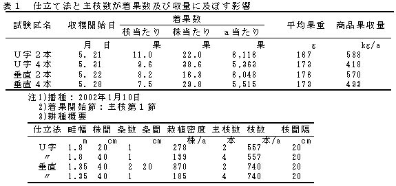 表1 仕立て法と主枝数が着果数及び収量に及ぼす影響