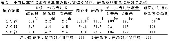 表3 垂直仕立てにおける主枝の摘心節位が開花、着果及び収量に及ぼす影響