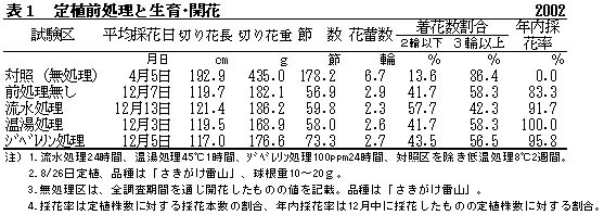 表1 定植前処理と生育・開花 2002
