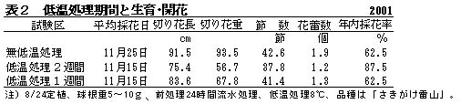 定植前に摂氏8度で2週間の低温処理を行うことで年内の採花率が向上する(表2)。