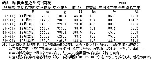 表4 球根重量と生育・開花 2002
