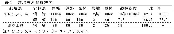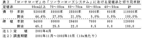 表3 「ローテローゼ」の「ソーラーローズシステム」における定植法と切り花本数