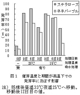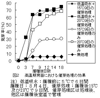 摂氏5度で6日の吸水処理後、摂氏15〜20度で6〜9日間処理すると、無処理や吸水処理無しに比べて発芽揃いも良く、高温期でも高い発芽率が得られる(図1、図2)。