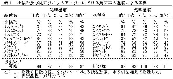 従来タイプのアスターは、摂氏10〜30度まで比較的安定して高い発芽率を示すが、小輪系アスターの発芽適温は狭く、概ね摂氏15〜20度で最も高い発芽率となる品種が多い。また、発芽適温においても90%以上の高い発芽率を示す品種は少ない(表1)。