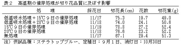 高温期の催芽処理による切り花品質への影響は小さい(表2)。