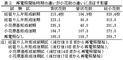 表2 再電照開始時期の違いが小花数の違いに及ぼす影響