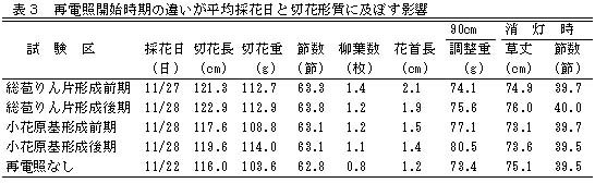 切花長、切花重等については再電照時期の違いによる大きな差は見られない(表3)。