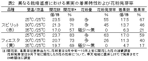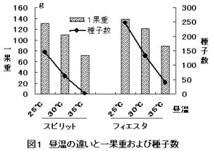 開花率および着果率は、昼温摂氏25度が最も高く、温度が高いほど低く、特に、昼温摂氏5度では着果率が著しく低下する。また、果実中の種子数も温度が高いほど少なくなり、摂氏35度では種子の無い果実が多発する(表2、図1)。