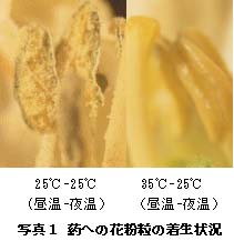 開花時の花粉量は昼温摂氏25度、摂氏30度では多いが、昼温摂氏35度では花粉が僅かにみられる程度であり、花粉の発芽率は、昼温摂氏25度が最も高く、昼温摂氏30度で低下し、昼温摂氏35度では全く発芽しない(表2、写真1)。