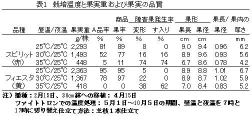 パプリカ(「フィエスタ」「スペシャル」)では、昼温が摂氏25〜35度の高温域では摂氏25度で果実重が最も重く、A品率も最も高くなる。摂氏30度以上では白い斑点が入るす入り果や変形果等の障害果の発生割合が増加する。1果重および果肉の厚さは昼温が高いほど減少し、摂氏35度では、果長が短くなり扁平の果形を示す(表1、図1)。