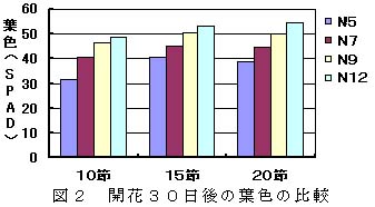 葉柄中の硝酸イオン濃度は、基肥を株当たりN成分9g以上にすることによって、メロンの養分吸収が最も盛んになる果実肥大期(開花〜開花後30日)に最も高く推移し、葉色も健全に推移する(図1、図2)。