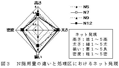 ネットの発現は基肥が株当たりN成分7〜9gで最も良く、N成分12gでは若干縦ネットが強く、果形が乱れる傾向にある(図3)。