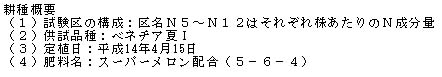 - 長崎型イチゴ高設栽培システムを用いたメロン栽培における基肥施肥量は株当たりN成分9gで体内窒素濃度が生育後期まで安定し、ネットの美しい、高糖度の果実が得られる。また、環境保全の観点からも基肥施肥量は株当たりN成分9gが適する。