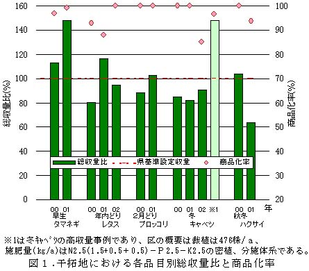 年内どりレタス及び2月どりブロッコリは年次変動はあるものの、概ね目標収量が確保でき、品質も良く栽培適応性はある(表1、図1)。