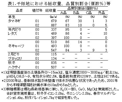 - 諫早湾干拓地の初期営農において、収量、品質の点から早生タマネギの栽培適応性は高い。年内どりレタス、2月どりブロッコリでは適応性は認められ、冬キャベツ、秋冬ハクサイはやや低い。