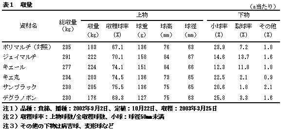 ジェイマルチ、キエール、キエ丸、サンプラックではポリマルチより高い上物収量が得られる(表1)。