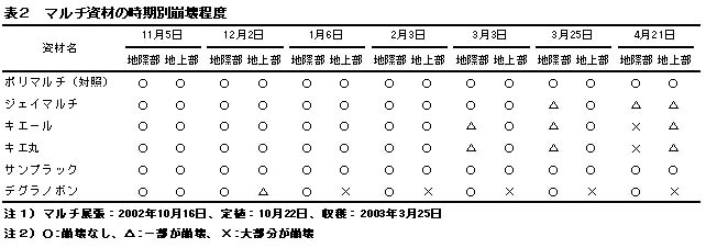 デグラノボンは定植後40日程度で風雨等の物理的な要因により地上部から分解が進み、畦面は早期に裸地状態となる(表2)。