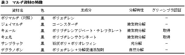 圃場へのすき込み処理行う場合には、資材の分解性・安全性が保証されたグリーンプラ認証取得製品を使用する(表3)。