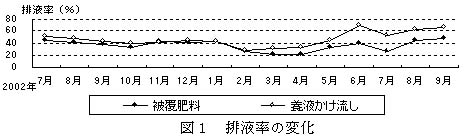 被覆肥料を施用した隔離床栽培のかん水量に対する排液率は、定植直後から養液かけ流し方式と同程度で推移するが、定植1年後からやや低くなり、15ヶ月間の総排液量は養液かけ流し方式に比べ少なくなる(図1)。