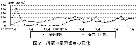 被覆肥料を施用した隔離床栽培の排液中窒素濃度は、定植直後は一時的に高くなり、その後かなり低く推移し、1年後から養液かけ流し方式と同程度になる(図2)。