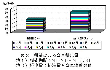 被覆燐硝安加里180日タイプ、被覆硝酸石灰140日タイプ、被覆硫酸加里180日タイプの肥料を組み合わせて施用する隔離床栽培は、養液かけ流し方式に比べ15ヶ月間の窒素排出量が38%減少する(図3)。当栽培法による被覆肥料の年間施肥量(現物g/株)は被覆燐硝安加里25g、被覆硝酸石灰50g、被覆硫酸加里30gである。