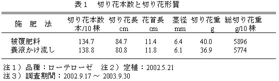 被覆肥料を施用した隔離床栽培の切り花本数、切り花形質は、養液かけ流し方式に比べほぼ同等程度である(表1)。