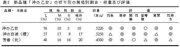 表2 新品種「沖の乙女」の切り花の規格別割合・収量及び評価