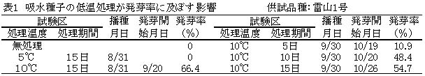 8月〜9月の高温時播種時は半日程度種子を吸水処理し、摂氏10度で15日間の低温処理をすると発芽率が向上する(表1)。