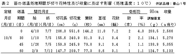 表2 苗の低温処理期間が切り花特性及び収量に及ぼす影響(処理温度:摂氏10度) 供試品種:雷山1号