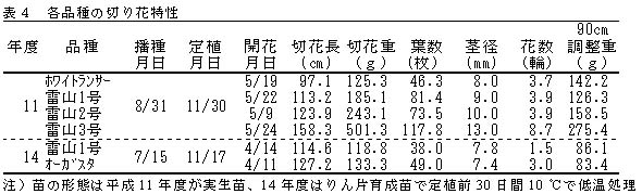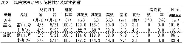 低温処理苗(摂氏10度、30日間)の11月中旬定植では、露地栽培は施設栽培と比較して開花は約1か月間遅れるが、切り花品質は向上する(表3)。