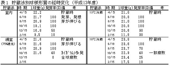 表1 貯蔵法別球根形質の経時変化(平成13年度)