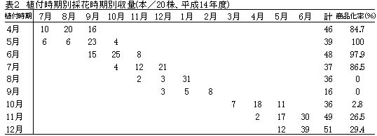 表2 植付時期別採花時期別収量(本/20株、平成14年度)