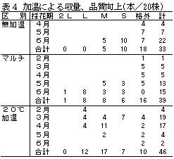気温の低下する11月下旬から最低気温摂氏20度に加温すれば、冬春期も収量、品質が向上する(表4)。