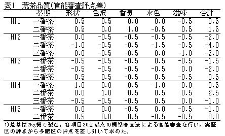 品質は減肥開始3年目以降、約80kg/10a施用した多肥茶園とほぼ同等となる(表1)。