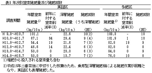 現地試験の年間窒素施肥量及び施肥回数の推移は表3のとおりである。