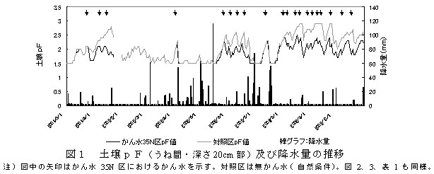 図1 土壌pF(うね間・深さ20cm部)及び降水量の推移