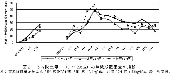 降水量が少なく土壌が乾燥する時にかん水を行い、生育に適正な土壌水分(pF2.3以下)を保つことで、うね間土壌中の無機態窒素量は高い値で推移する(図1、図2)。