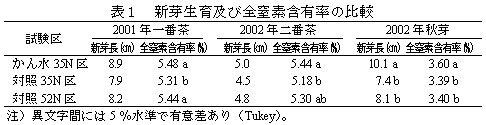 かん水管理を行うと茶芽の生育が旺盛となり、新芽中の全窒素含有率も高くなることから、少雨時のかん水は施肥削減に有効である(表1)。