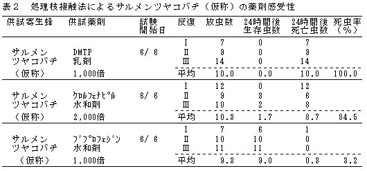 表2 処理枝接触法によるサルメンツヤコバチ(仮称)の薬剤感受性