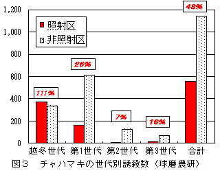 チャノキイロアザミウマの発生が非照射区比169%と多くなる傾向がある(データ省略)。