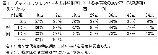 チャノコカクモンハマキに対する黄色高圧ナトリウムランプの夜間点灯は、設置位置から半径36m以内で非照射区に対する巻葉数の減少率は92〜57%と高く(表1)、密度抑制効果は約30m程度に及ぶ。また、チャノホソガに対しては光源から5mの位置で非照射区に対する巻葉数の減少率は73%である(データ省略)。