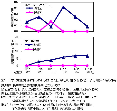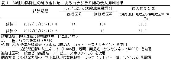 施設栽培トマトにおいて、被覆ビニルに近紫外線除去フィルムを使用し、あわせて施設開口部を防虫ネットで被覆する物理的防除法は、これらの無設置に比べてコナジラミ類の侵入を約50〜85%抑制する(表1)。